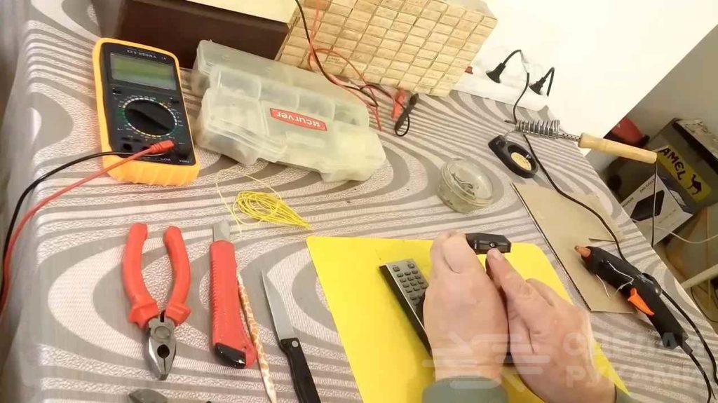 На следующем этапе подбираем батарейки и спаиваем их вместе. Выводим кнопку включения и выключения на боковую панель. Приклеиваем её клеевым пистолетом.
