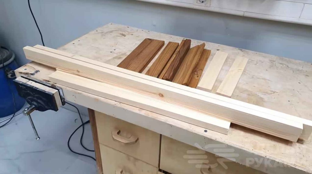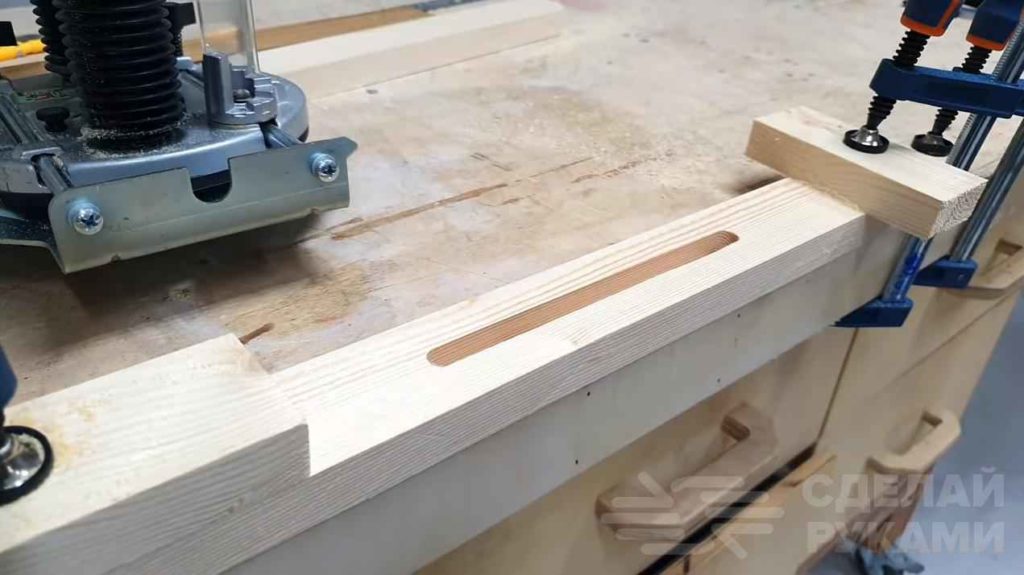 На следующем этапе отпиливаем края ножек под углом. В двух упорных ножках мастер с помощью ручного фрезера выбирает пазы.