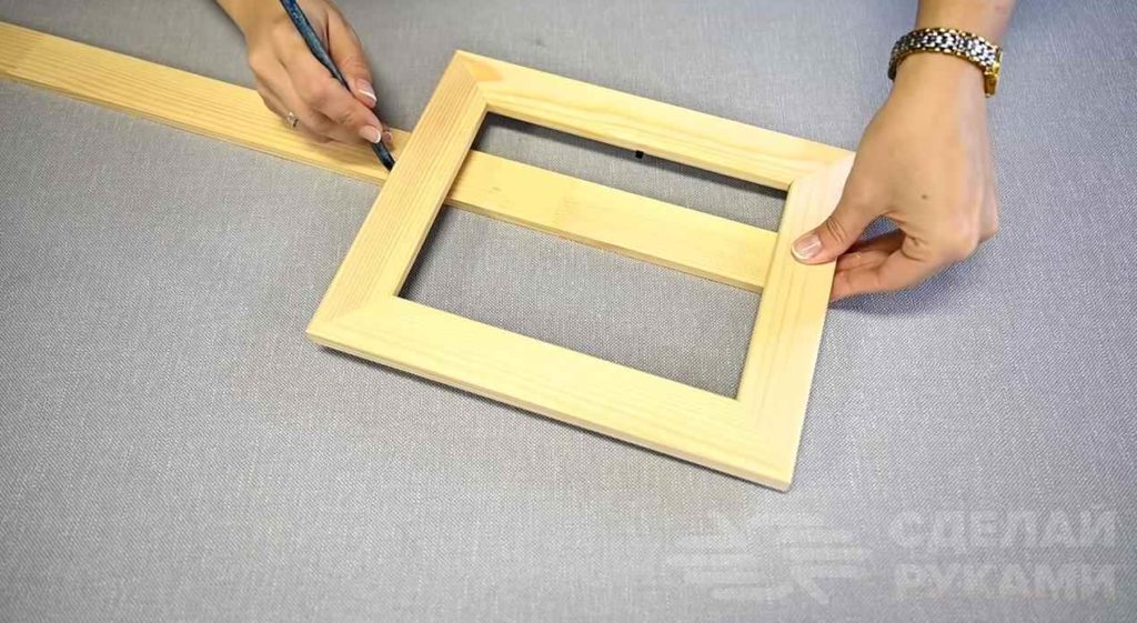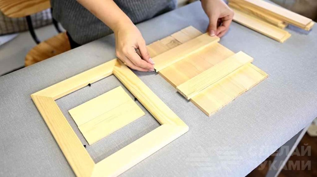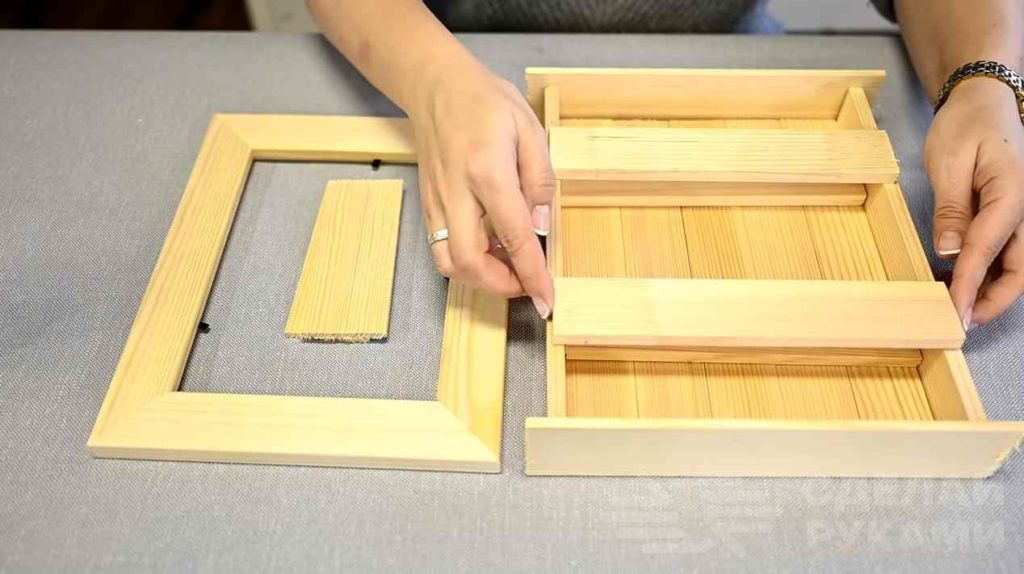 Первым делом необходимо напилить деревянные рейки по размеру (по высоте фоторамки). Их нужно напилить такое количество, чтобы сложить из них потом заднюю и боковые стенки. Заднюю стенку ключницы также можно сделать из куска фанеры.