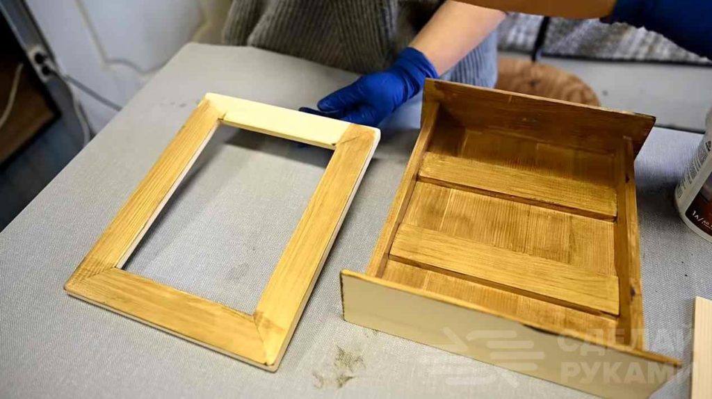 На следующем этапе необходимо будет напилить деревянные рейки, чтобы сделать дно и крышу ключницы. Они должны выступать за стенки на пару сантиментов.