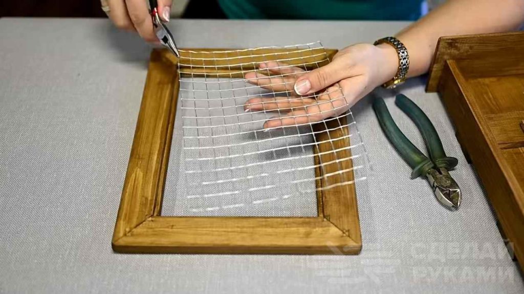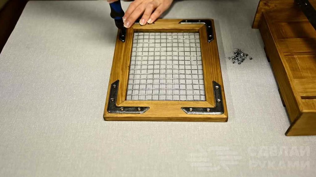 Отверстие в дверце нужно закрыть металлической сеткой с мелкими ячейками или же можно вставить стекло. После этого красим всю металлическую фурнитуру и крепим ее к собранному ящику.