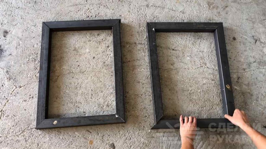 Свариваем сначала две прямоугольные рамки. Это будут ножки скамейки. Затем свариваем каркас сиденья и спинки. Сварные швы зачищаем болгаркой.
