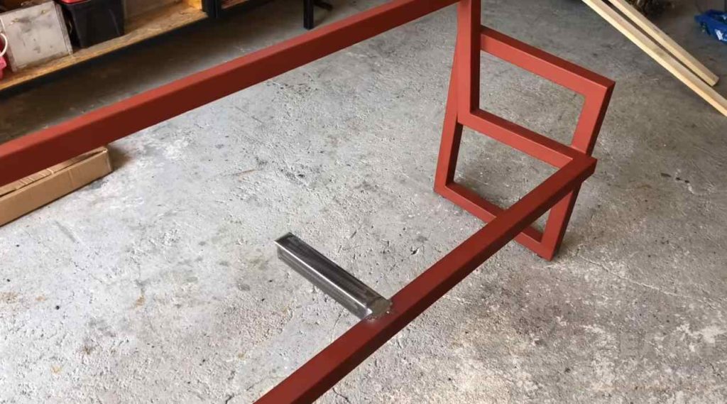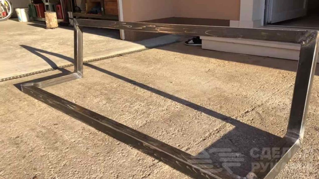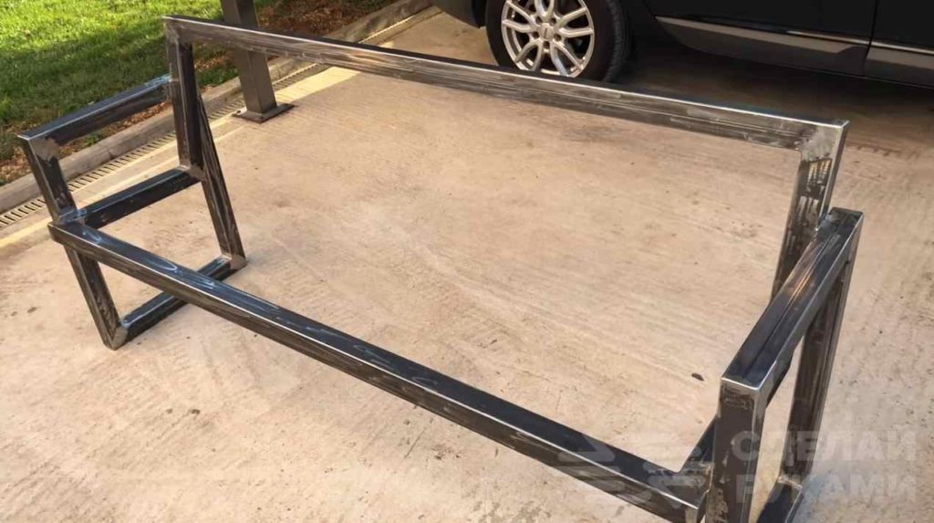 На следующем этапе привариваем ножки по бокам основного каркаса. По центру профильной трубы мастер дополнительно приваривает усиление, чтобы деревянные рейки не прогибались.