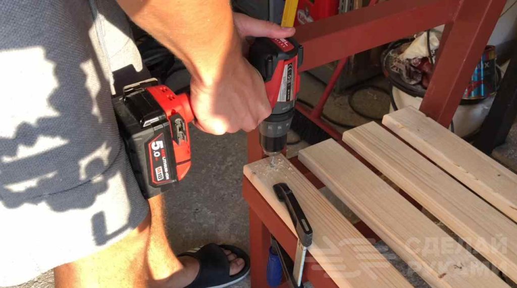 Металлический каркас необходимо прогрунтовать, потом — покрасить. Сверлим крепежные отверстия и прикручиваем подготовленные деревянные рейки.