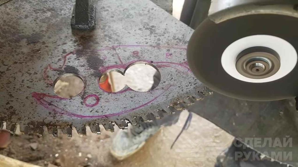 Первым делом прикладываем бумажный шаблон топорика к пильному диску и обводим его маркером. Вырезаем болгаркой по контуру.