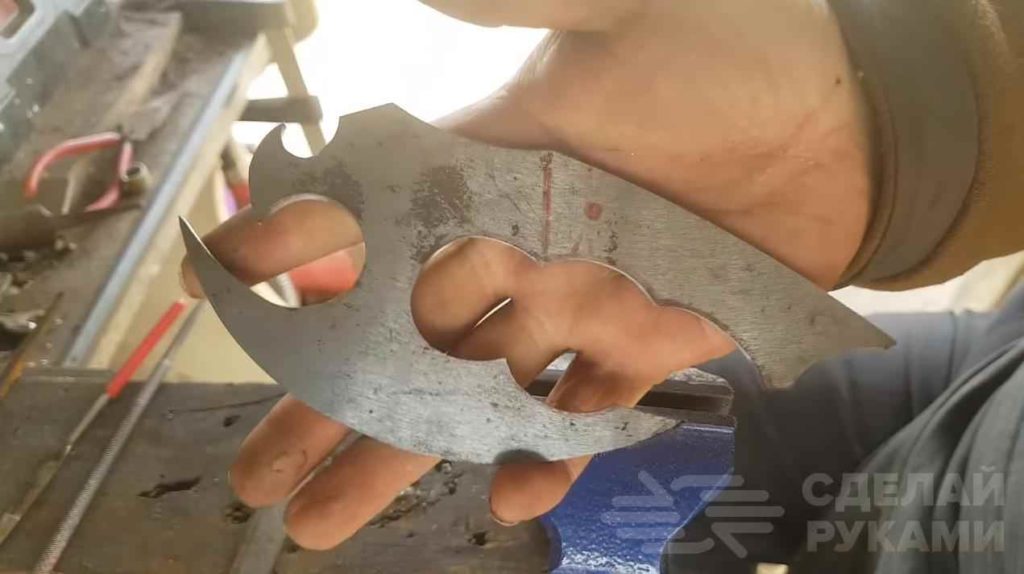 Из куска толстого металла необходимо будет вырезать две заготовки. Крепим их с помощью заклепки к топорику.