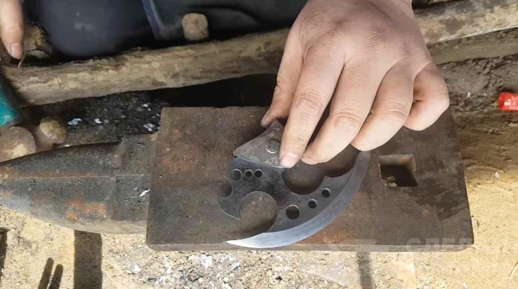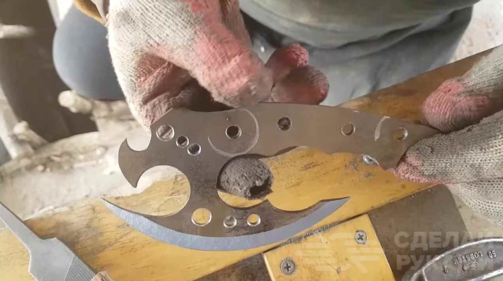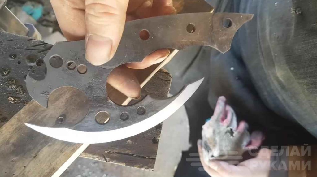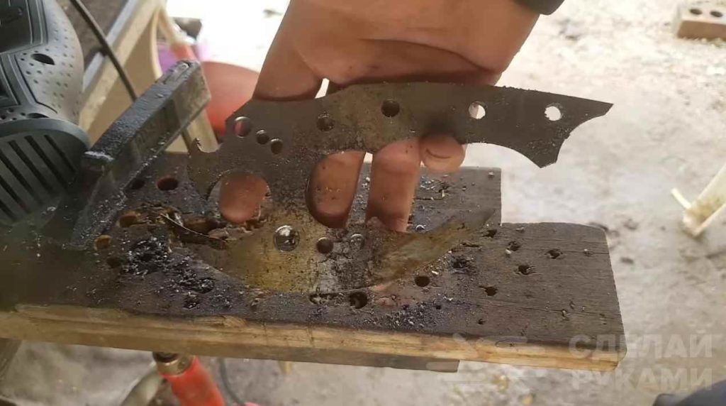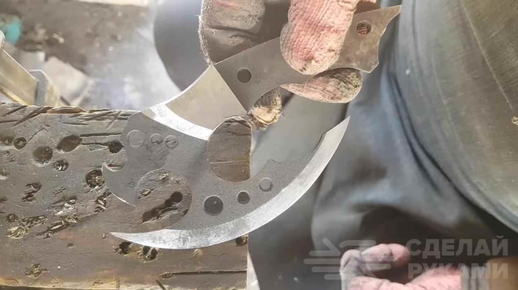 После этого автор выполняет закалку и отпуск заготовки. Процедура стандартная: нагреваем докрасна, охлаждаем в масле и отпускаем металл в духовке. Потом затачиваем лезвие.