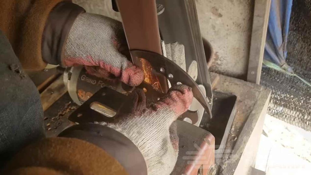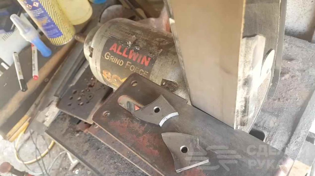 На следующем этапе на гриндере автор делает спуски лезвия на заготовке, а также черновую заточку.