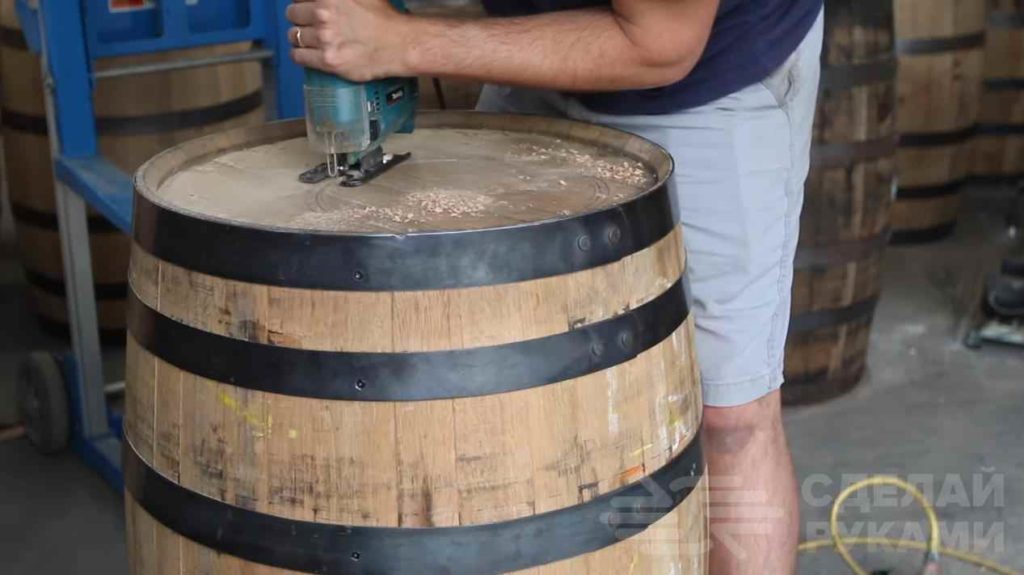 Первым делом переворачиваем деревянную бочку вверх дном, и вырезаем в основании круглое «окно» для подвода коммуникаций к раковине.
