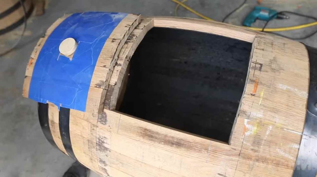 На следующем этапе вырезаем отверстие под раковину в верхней части бочки. Также необходимо будет вырезать дверку. В качестве ручки будет служить пробка в отверстии бочки.