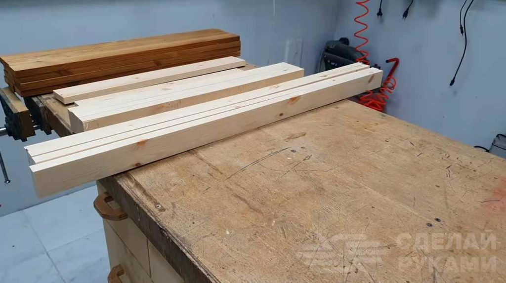Первым делом необходимо будет напилить доски подходящей длины. Что касается размеров раскладного столика, то они могут быть разными — на ваше усмотрение.