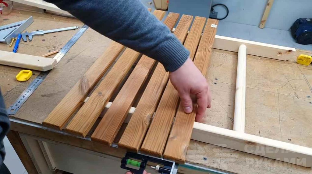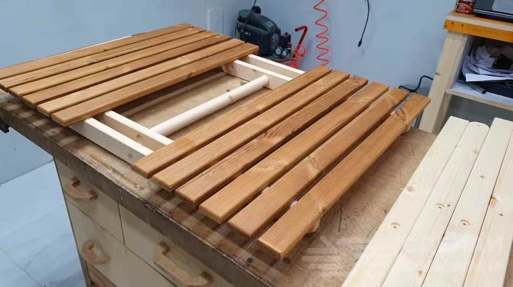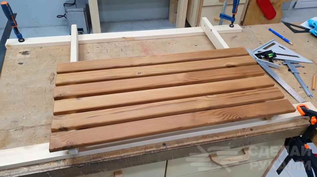 Прикручиваем к ним подготовленные деревянные рейки. В результате получилась первая часть столешницы.