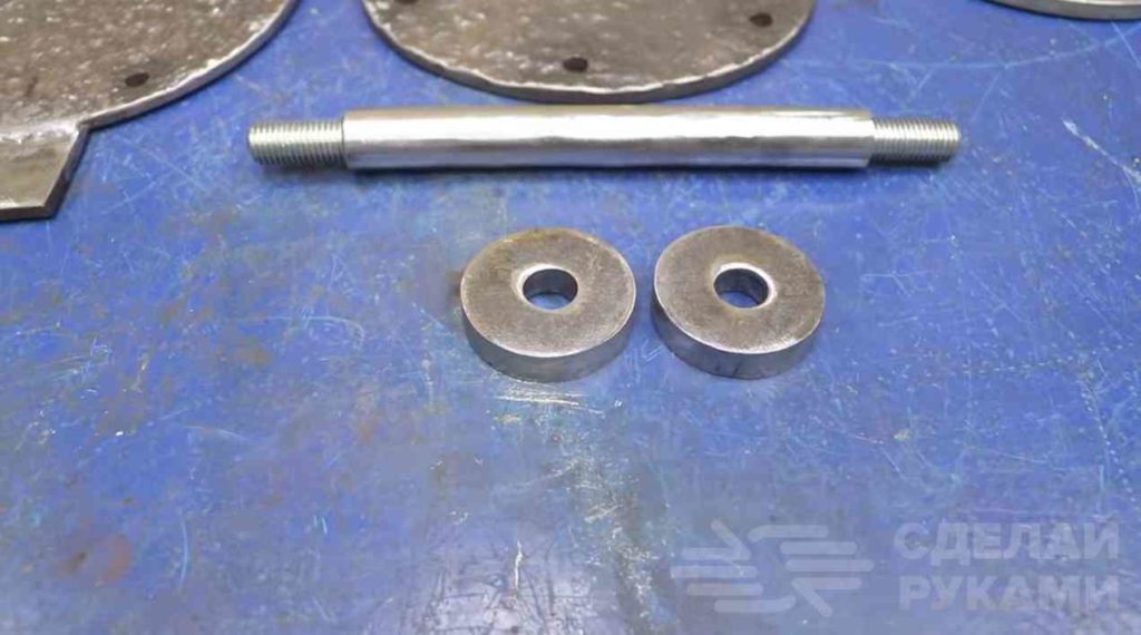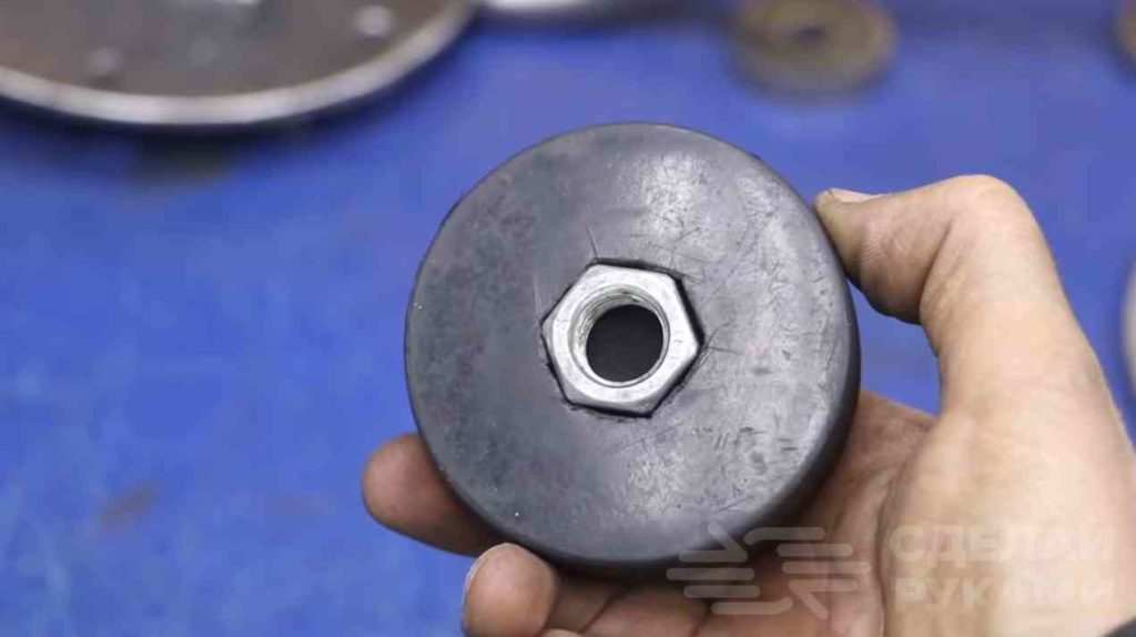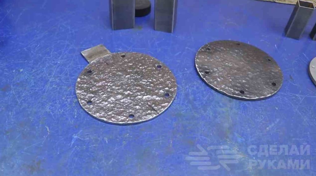 Из листа металла толщиной 10 мм нужно будет вырезать два круга. Предварительно в них надо просверлить отверстия диаметром 16 мм. Торцы вырезанных деталей нужно отшлифовать с помощью лепесткового диска для УШМ.