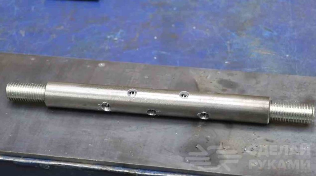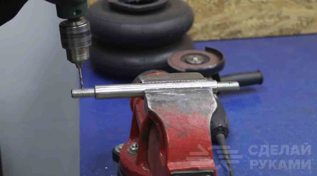 По краям шпильки, которая вставлена в трубу, автор сверлит два отверстия, чтобы при сборке в них можно было вставить шплинты.
