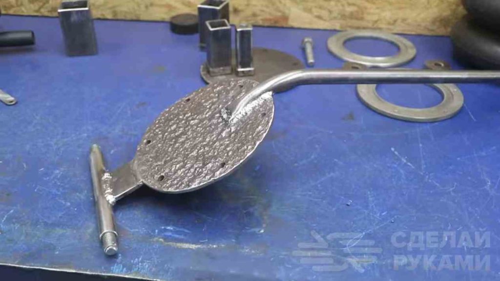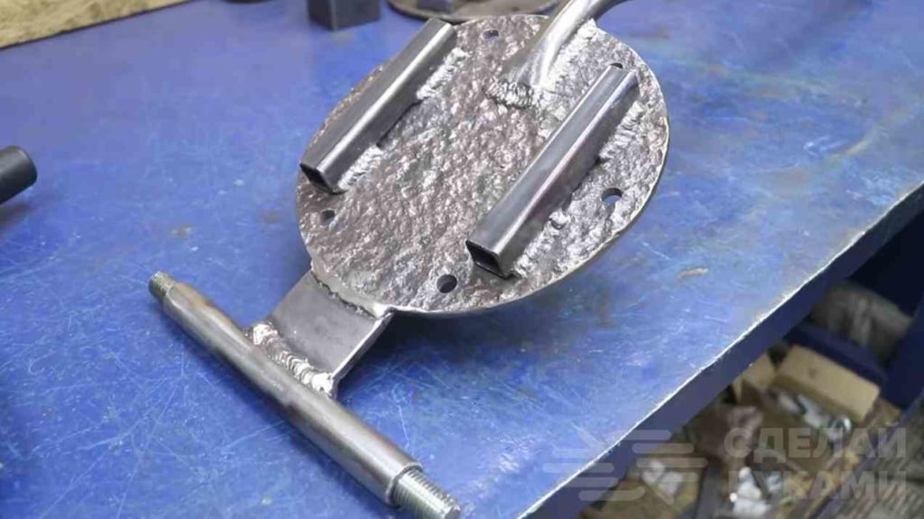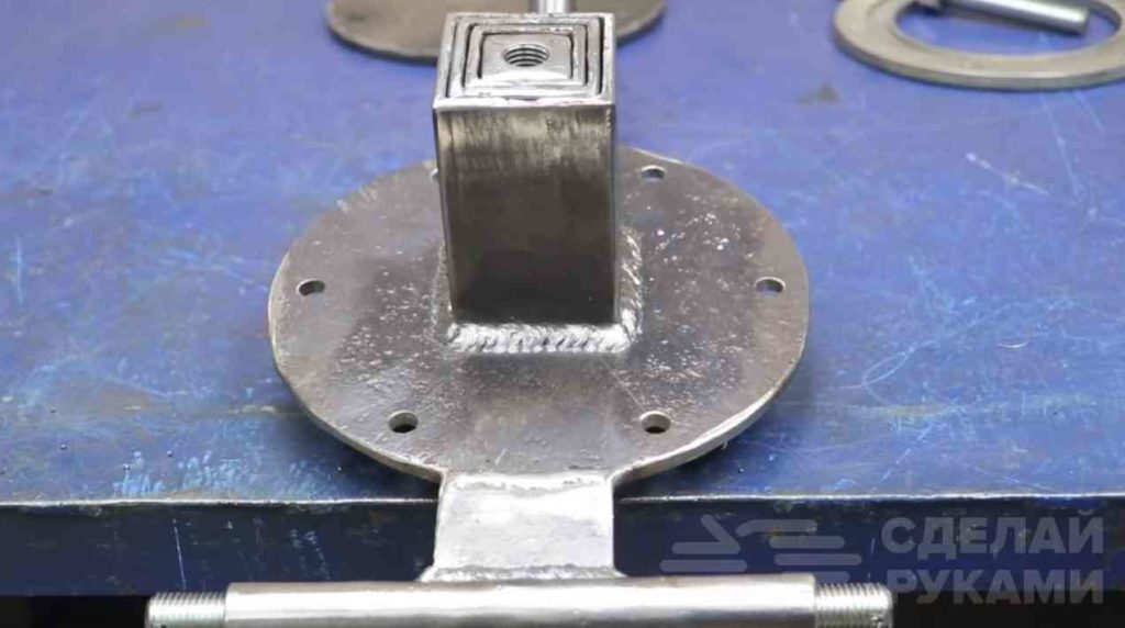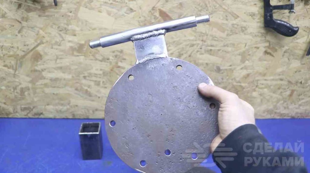 На следующем этапе полудюймовую трубу со шпилькой нужно приварить к пластине, которая приварена к кругу.