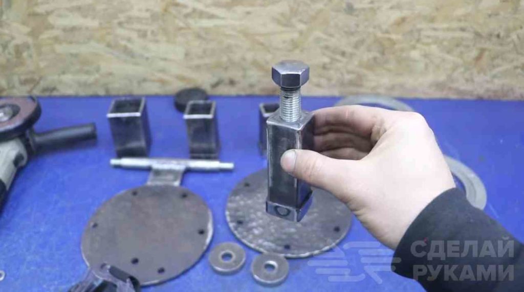 В верхней части отрезка профильной трубы 30*30 мм надо приварить гайку. Потом в нее вкручивается болт.