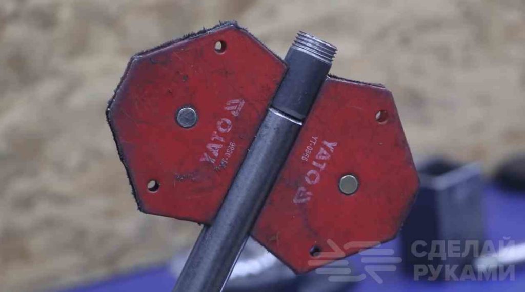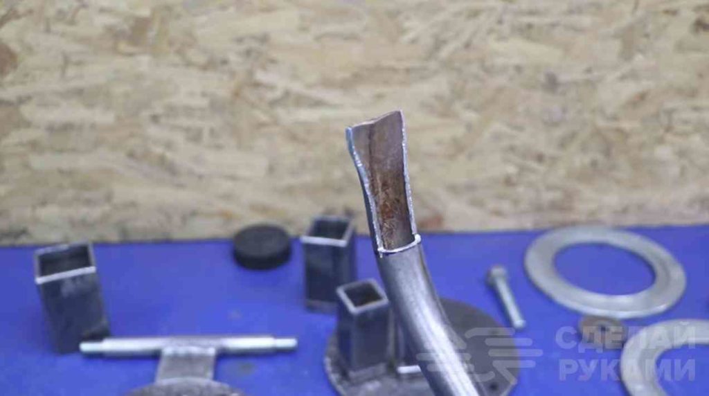 Из остатков металла толщиной 6 мм автор вырезает деталь прямоугольной формы и приваривает ее к одному из кругов. Предварительно на заготовке нужно будет снять фаски.