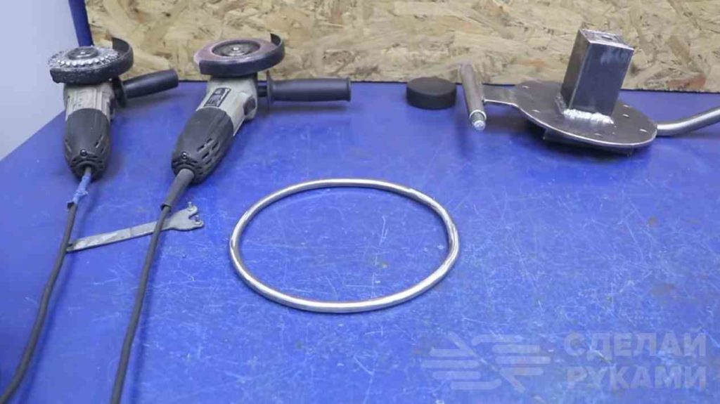 Из полосы, вырезанной из листа металла толщиной 2 мм, автор сгибает еще одно кольцо. Его нужно приварить ко второму кругу таким образом, чтобы шляпка болта находилась в центральной части.
