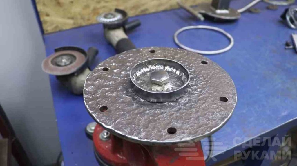 Далее нужно будет просверлить отверстие диаметром 16 мм по центру второго круга. В него вставляем болт и обвариваем со стороны шляпки.