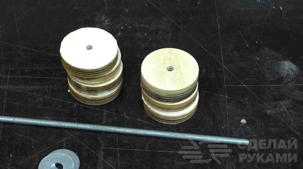Набираем нужное количество кругов, надеваем их на шпильку, предварительно намазав клеем, после чего стягиваем гайками. Ждем, пока высохнет клей.