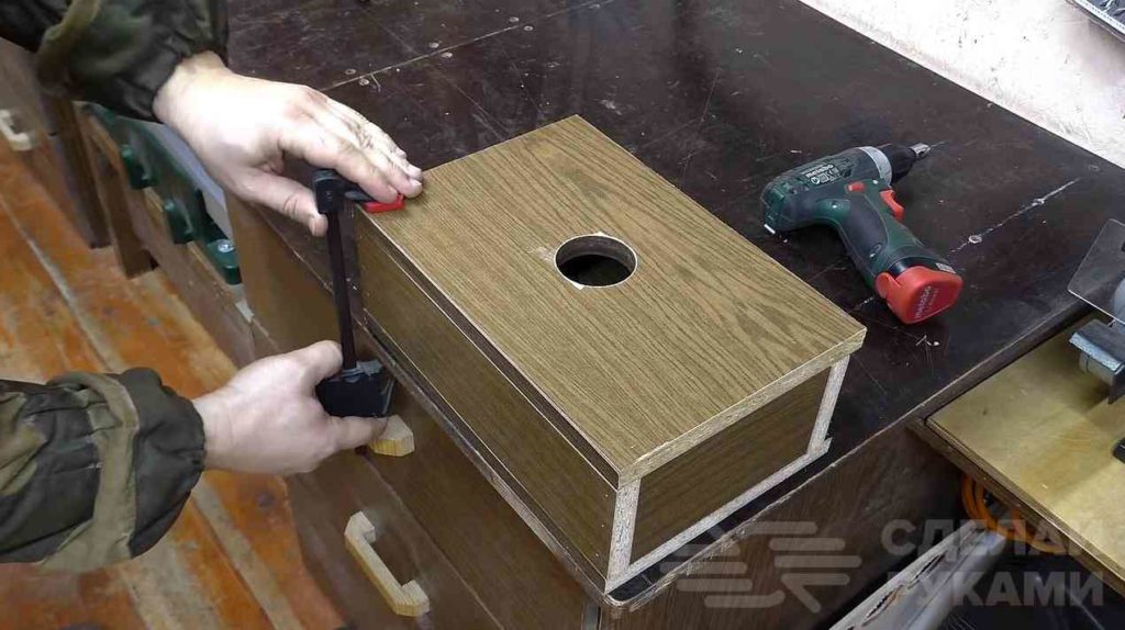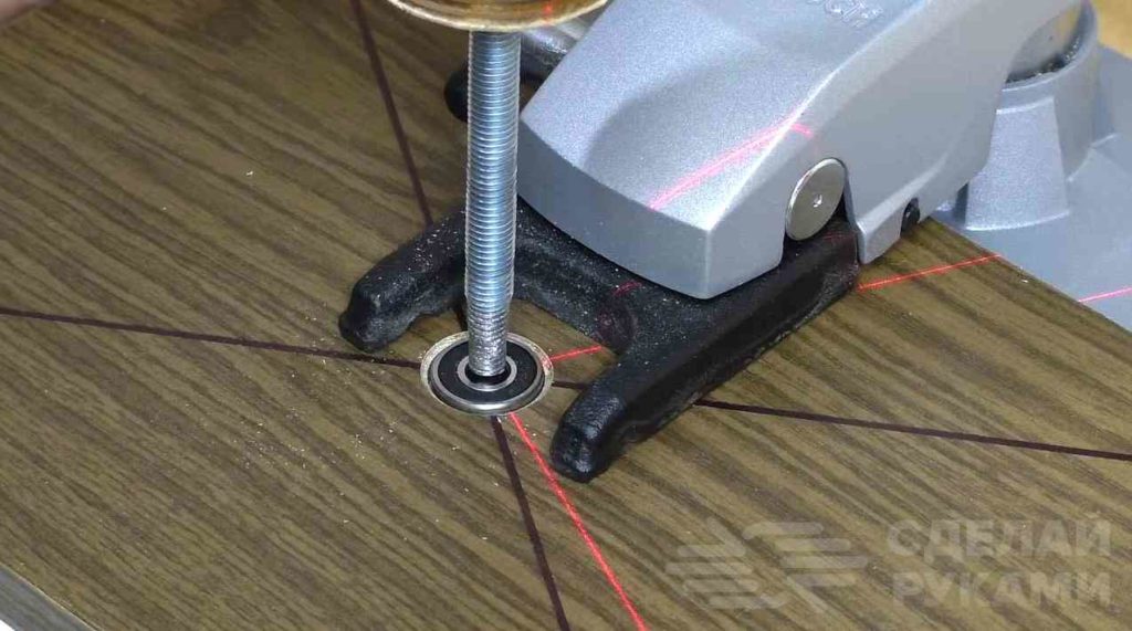 На следующем этапе автор отрезает кусок ДСП, делает разметку и сверлит по центру отверстие — посадочное место для подшипника. Сам подшипник надо надеть на шпильку.