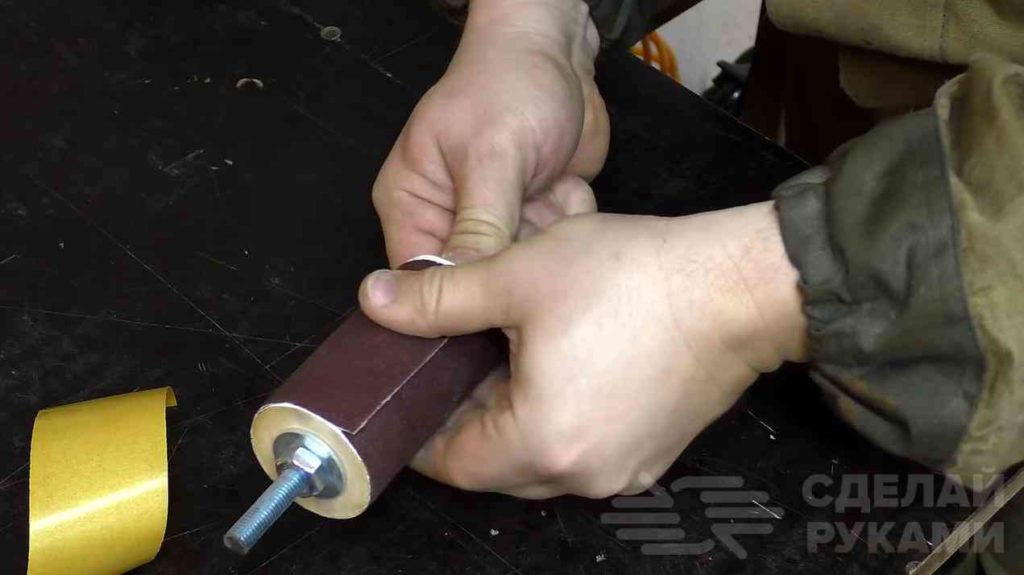 Далее наклеиваем на барабан двусторонний скотч, после чего крепим наждачную бумагу нужной зернистости. Шлифовальная насадка готова — она будет фиксироваться в патроне сверлильного станка.