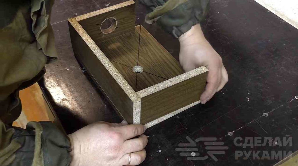 Из кусков ДСП (можно также использовать фанеру) мастер собирает рабочий столик. Сбоку нужно просверлить отверстие для шланга пылесоса. В верхней части сверлим отверстие под барабан.