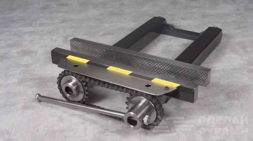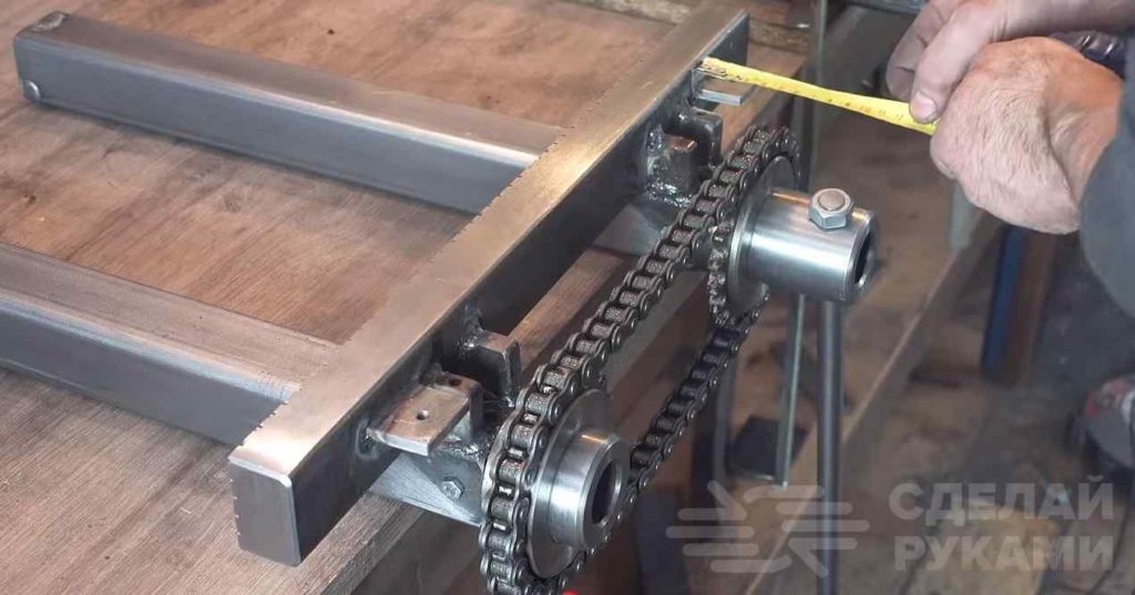 В завершении останется только соединить ходовые винты с звездочками, после чего натягиваем цепь. Устанавливаем ручку.