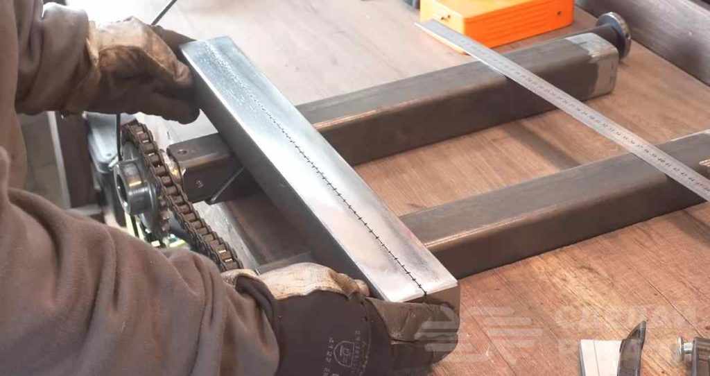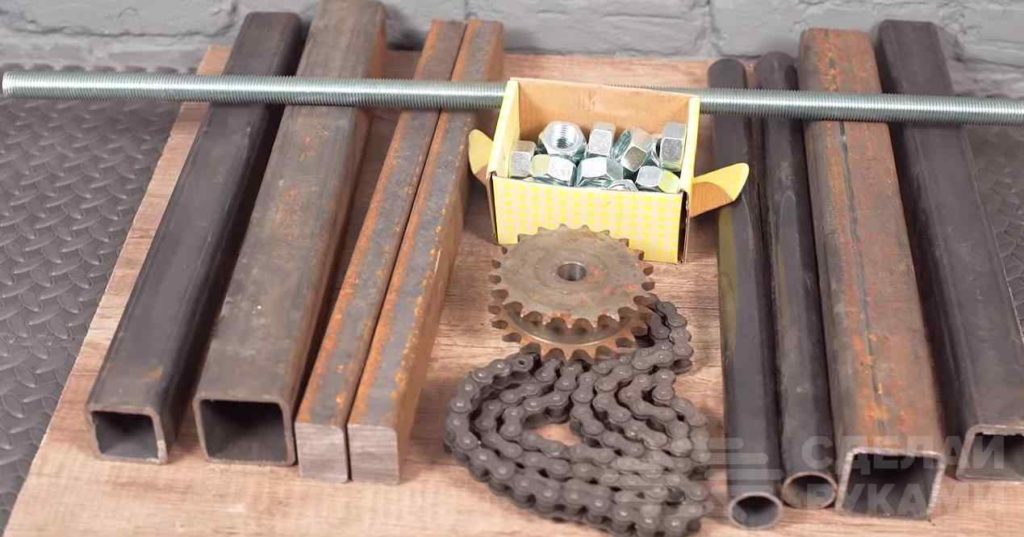 Из основных материалов нам потребуются круглые и профильные трубы, толстые куски металла, звездочки, цепь, шпилька и гайки.