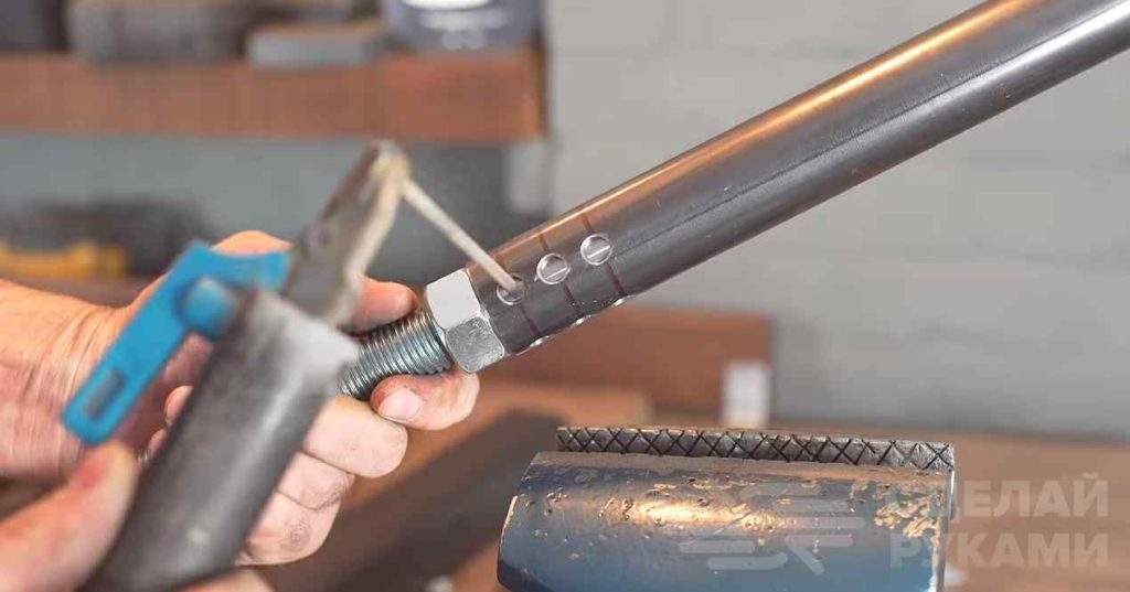 Вставляем шпильки с гайками в круглую трубу и обвариваем (для этого в трубе предварительно нужно просверлить отверстия). С другой стороны трубы вставляем заглушки и тоже обвариваем.