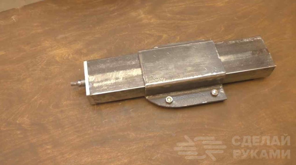 В результате у нас получилось основание слесарных тисков, которое будет крепиться к столу. В основание вставляется кусок швеллера. А внутри швеллера находится ходовой винт.