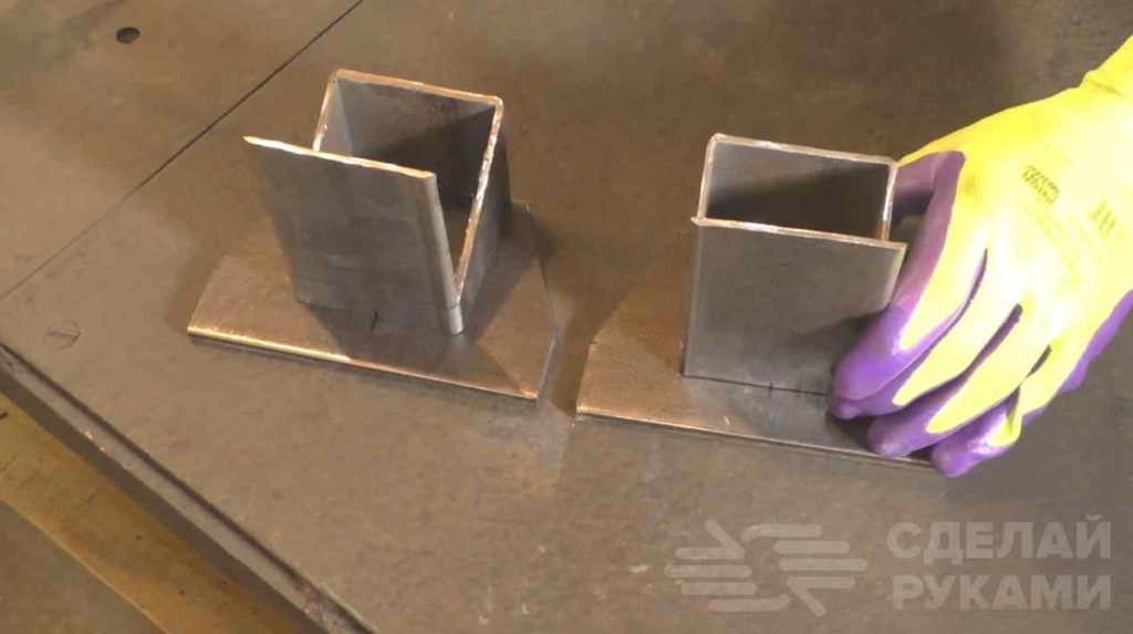 Первым делом необходимо нарезать заготовки нужного размера. Потом к металлической пластине автор прикручивает два уголка. К верхней части уголков надо будет приварить еще один кусок металла.