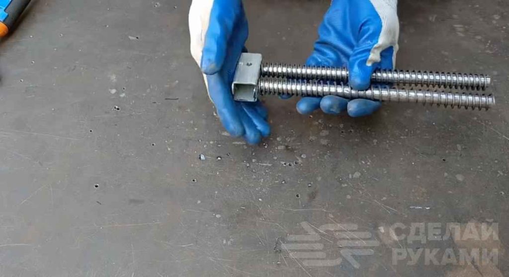Надеваем пружины на арматуру и привариваем к торчащим краям арматуры ещё один кусочек арматуры, перпендикулярно предыдущим. Теперь нужно изготовить подвижную губку.