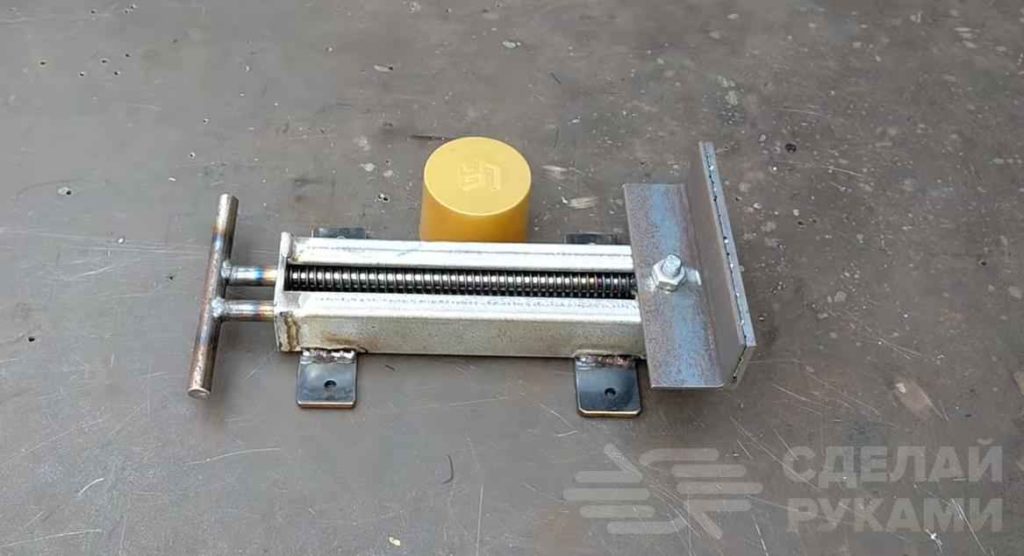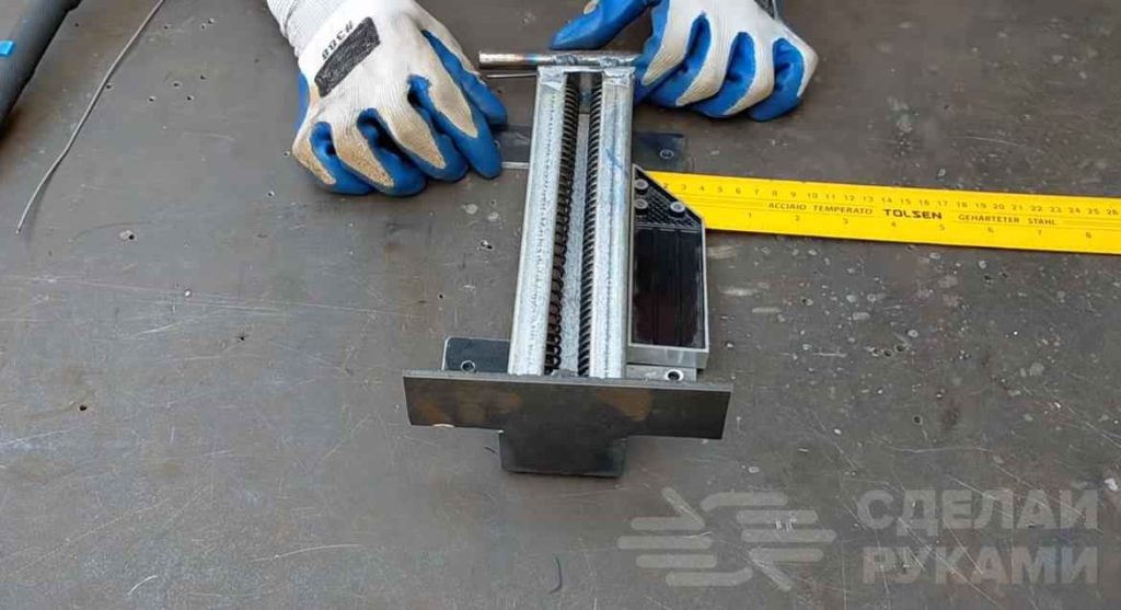 Устанавливаем подвижную часть нашей самоделки в профиль и продеваем через неподвижную губку. Выравниваем и привариваем губку к профилю.