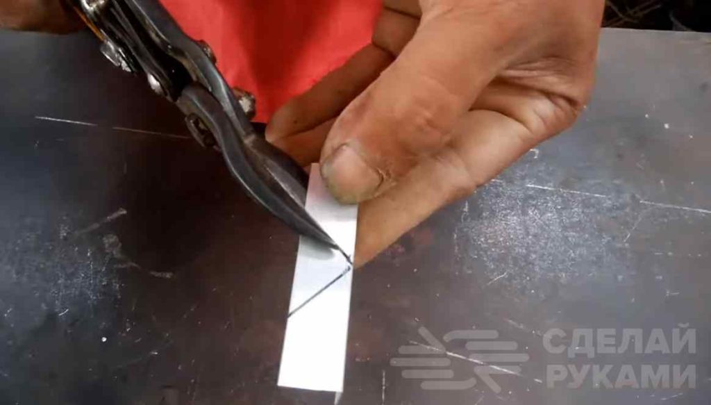 Первым делом автор делает маленький шаблон. Нужно будет отрезать небольшой кусок уголка, потом сделать разметку, и при помощи ножниц по металлу вырезать треугольники в центральной части заготовки.