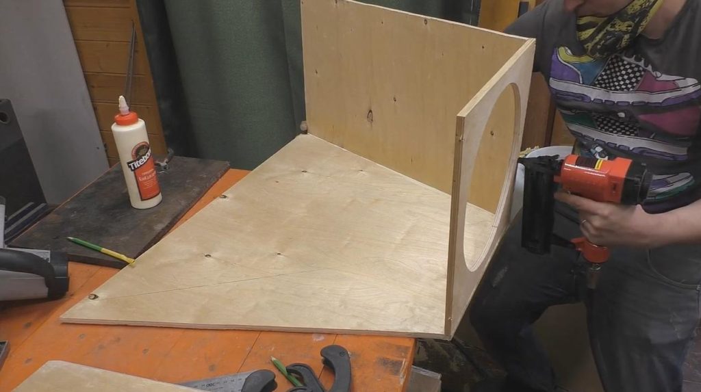На следующем этапе автор приступает к сборке короба. В тыльной стороне надо будет вырезать круглое отверстие, чтобы можно было установить пылесос.