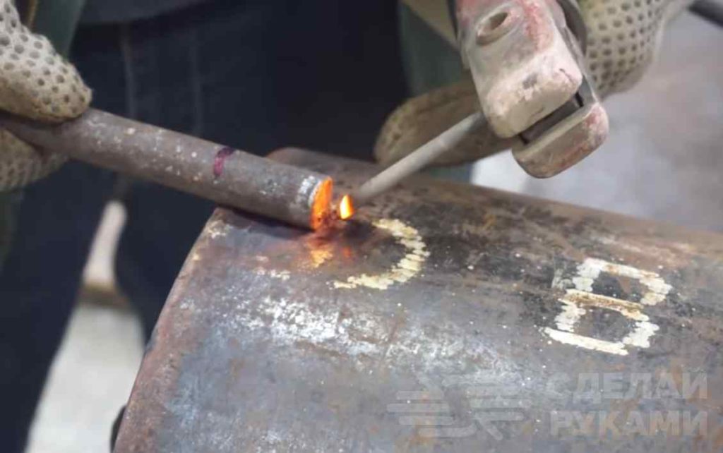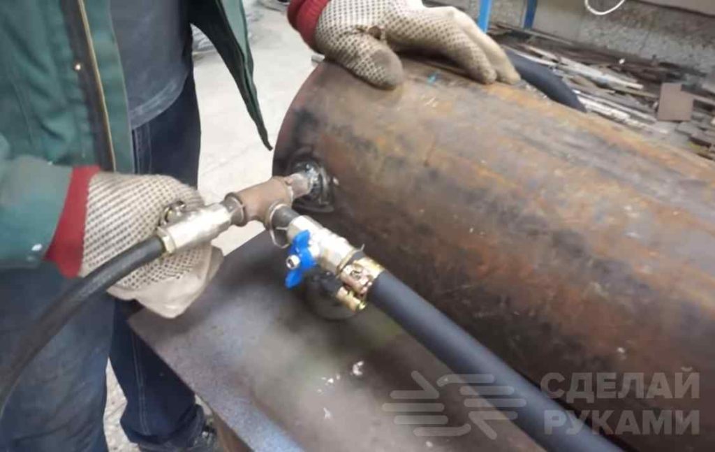 В верхней боковой стенке трубы просверливаем ещё одно отверстие для подачи воздуха и также установим трубку с резьбой. Для устойчивости изготовим ножки из прутка и приварим их к нижней части бака.