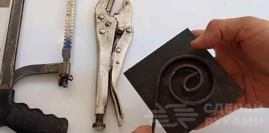Первым делом из металлической полосы необходимо сделать завиток подходящего размера. Потом привариваем его к квадратной пластине.