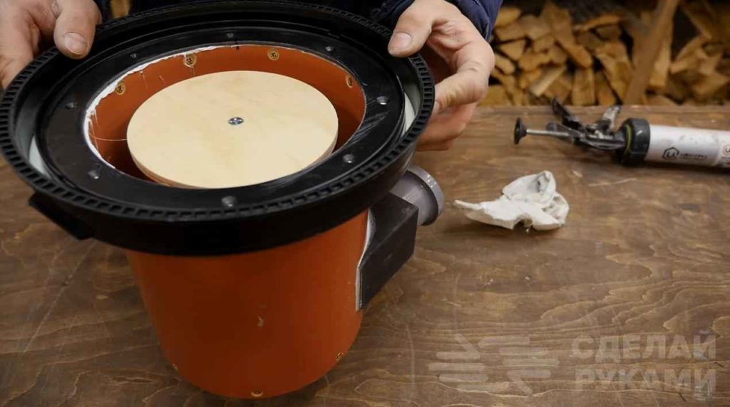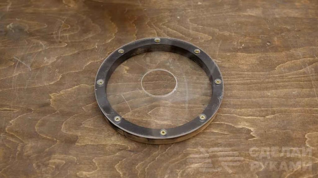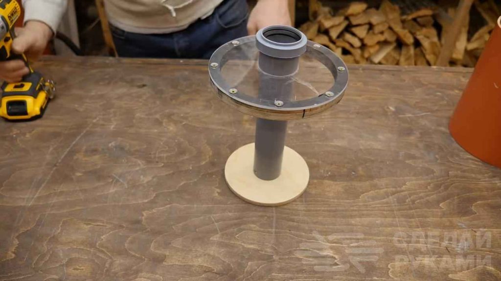 На следующем этапе вырезаем кольцо из фанеры. К нему прикручиваем на саморезы кусок оргстекла. Затем обе изготовленные детали нужно соединить вместе с куском пластиковой канализационной трубы.