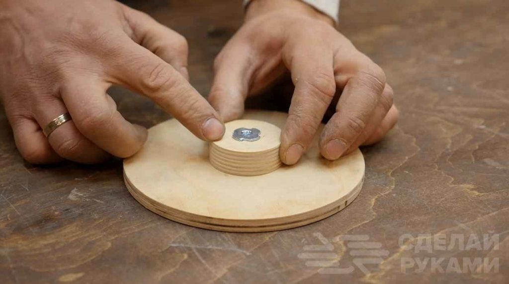 Далее вырезаем два круга из фанеры. В заготовку меньшего размера автор вбивает гайку, просверлив под нее отверстие.