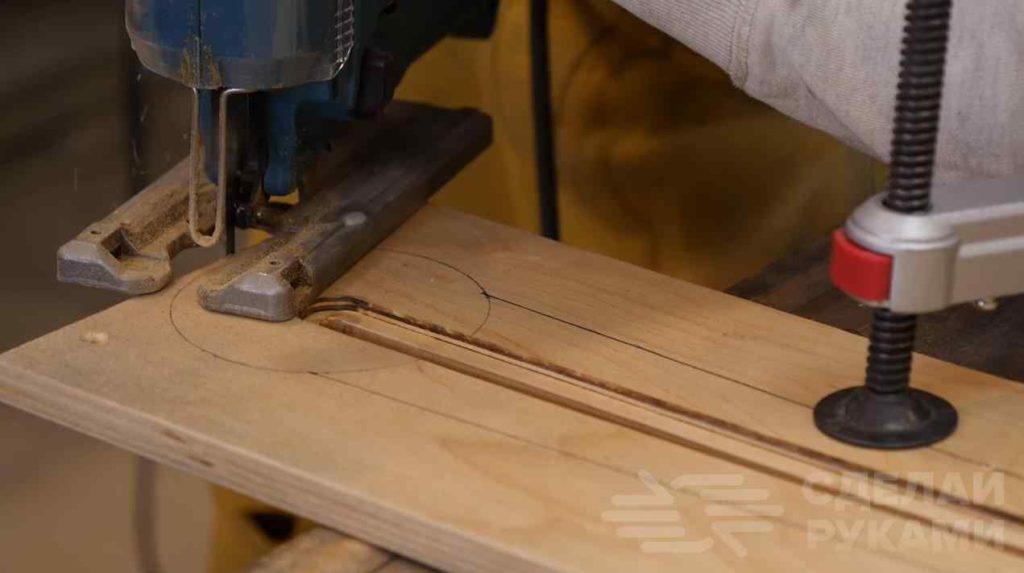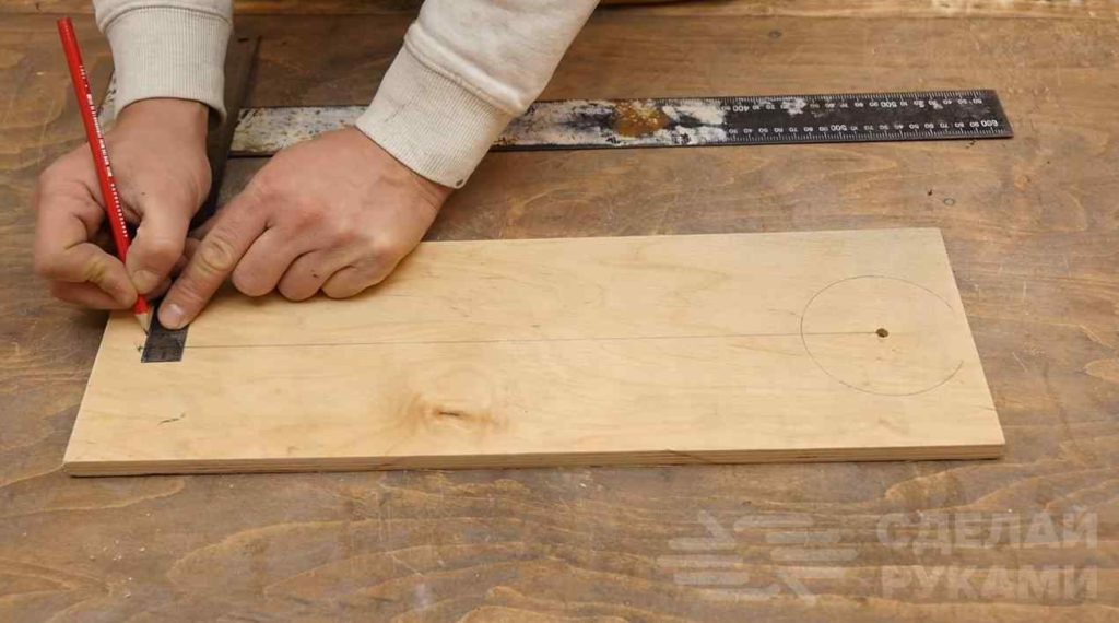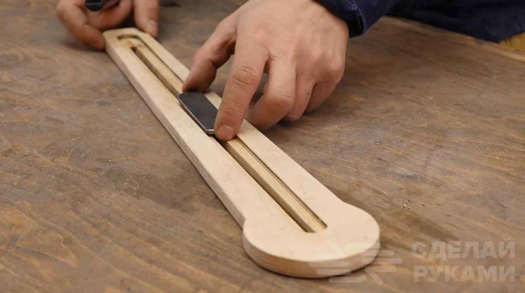 Первым делом отрезаем подходящий по размеру кусок фанеры и делаем на нем разметку. При помощи фрезера выбираем сквозной продольный паз.