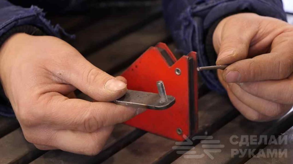 В полосе сверлим два отверстия. В одно отверстие ввариваем кусок шпильки с резьбой, в другое — кусок стальной проволоки.