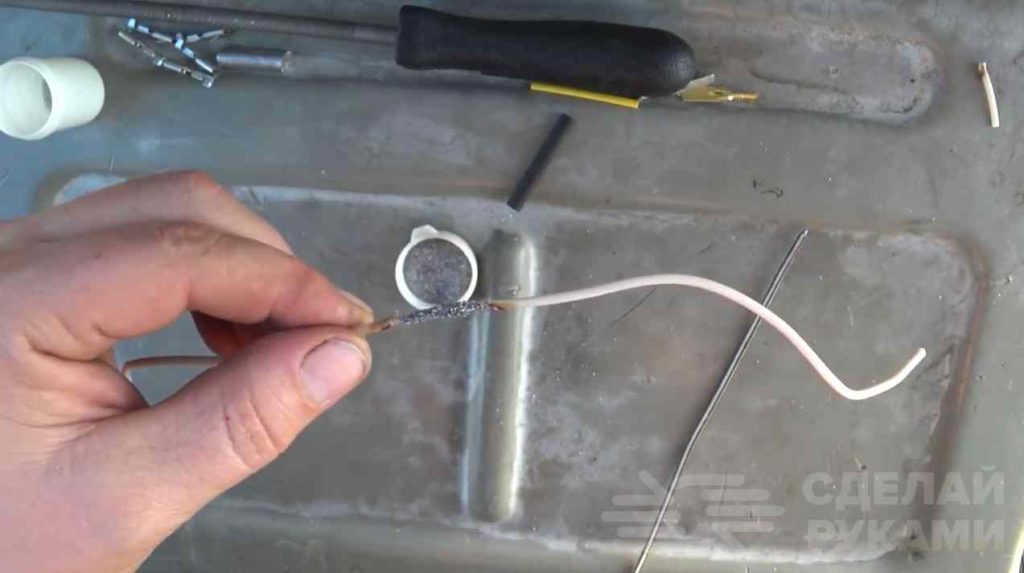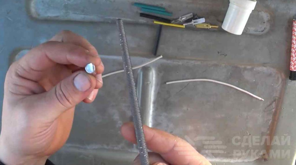 Первым делом необходимо будет снять изоляцию и оголить концы проводов, после чего соединить их вместе (для этого автор использует классическую скрутку). Потом смачиваем место соединения флюсом.