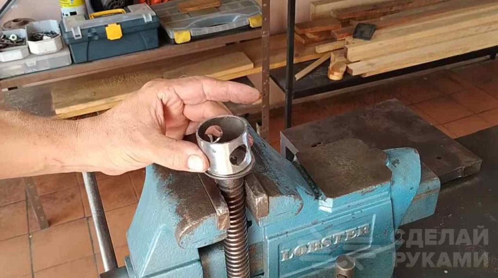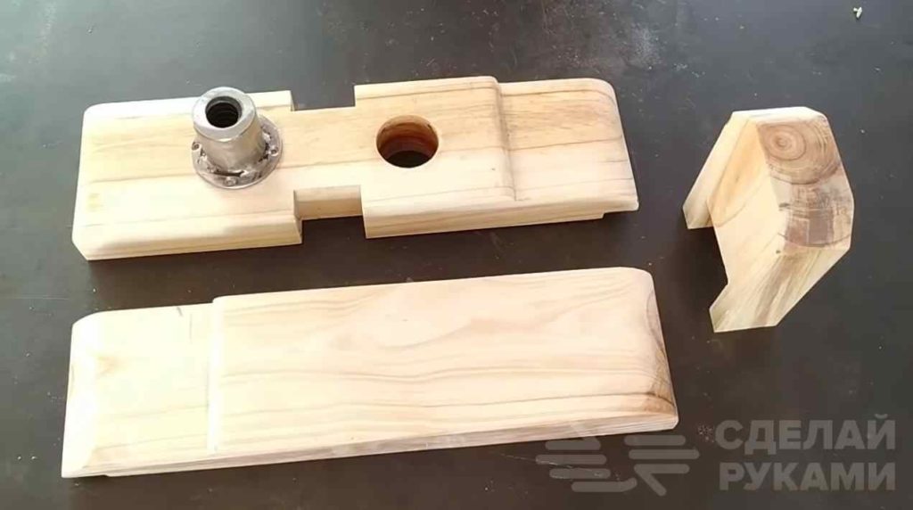 С внутренней стороны устанавливаем шайбу и закрепляем её при помощи металлического хомута или пальца. Приворачиваем деревянные губки. В нижней части просверливаем отверстие под направляющую шпильку.