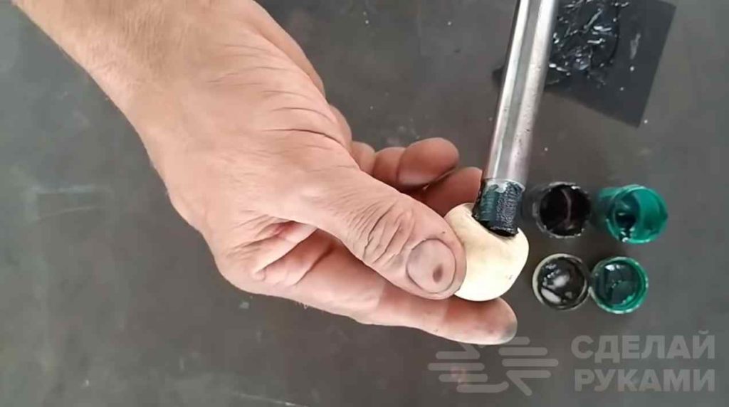 Внутрь трубы забиваем деревянный брусочек подходящего диаметра. Просверливаем насквозь и устанавливаем ручку вращения. По краям ручки приделываем ограничители из дерева.