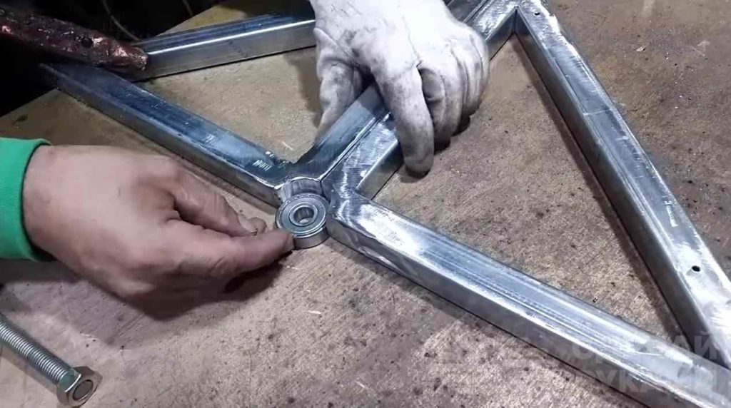 Теперь нужно совместить вершины третьей пары треугольников и вырезать в них часть, размером под половину подшипника. Перед сваркой укладываем оба подшипника друг на друга и привариваем их.