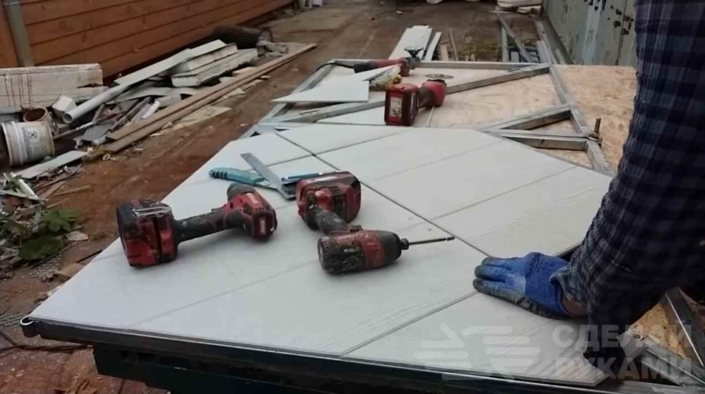Далее необходимо просверлить в уголке монтажные отверстия для закрепления на косяке. Складываем всю конструкцию на плоской поверхности и приступаем к распиловке облицовочного материала.