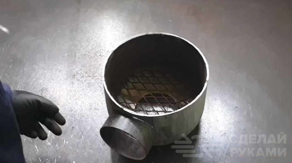 Привариваем отрезок трубы к этой части бака. Это будет отверстие для отведения золы и пепла. Зачищаем сварные швы, а также все поверхности от старой краски.