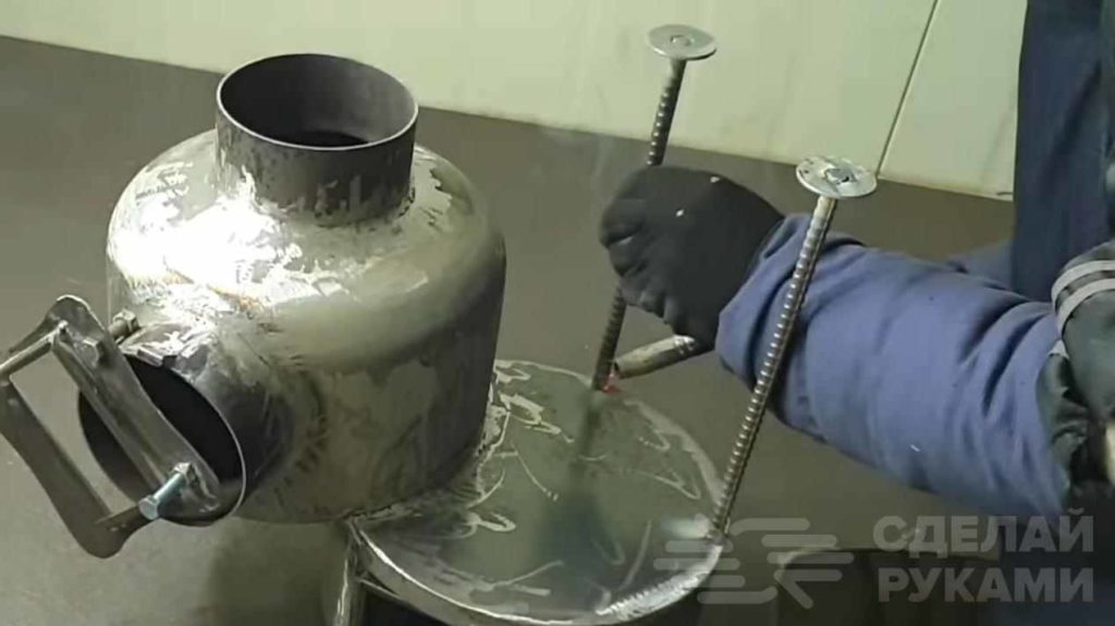 Отрезаем и подгоняем на своё место. Теперь привариваем верхнюю крышку нижнего баллона, и дно верхней части баллона. Для устойчивости привариваем несколько кусков арматуры в четырёх местах.