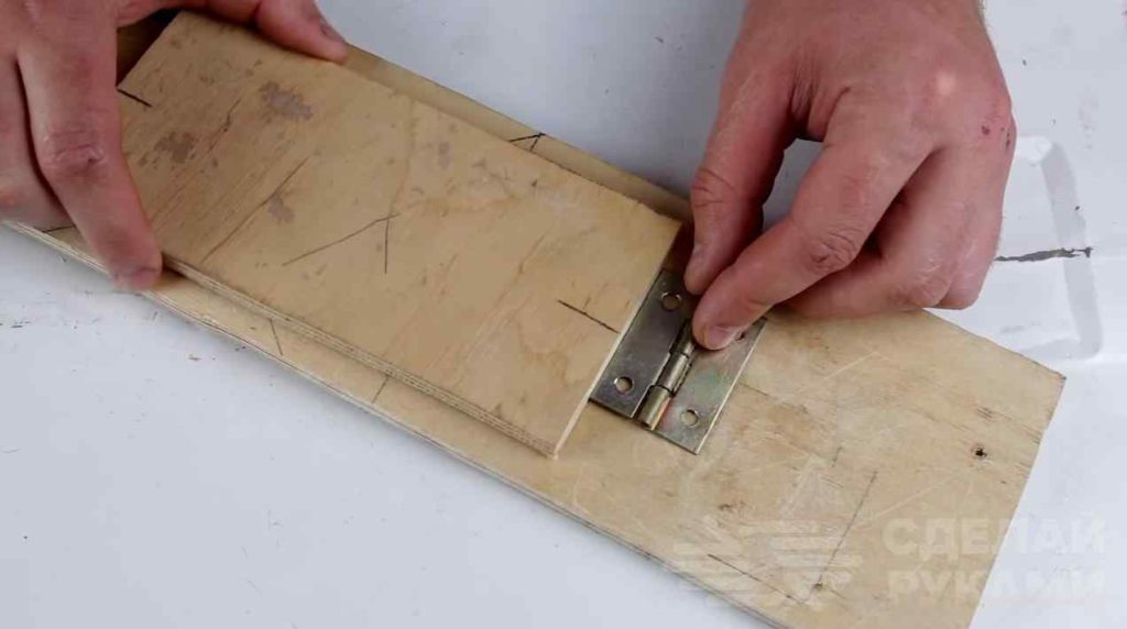 Далее надо будет сделать регулируемую подающую площадку. Отпиливаем кусок фанеры и крепим его к внутренней стороне боковой стенки при помощи петли.